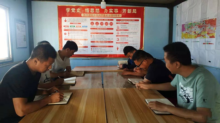 2021年6月2日下午,地质公司扫子山综合项目部开展了党史理论学习及研讨活动。旨在党史学习中坚定理想信念、继承宝贵经验、弘扬革命精神。 学好百年党史,汲取奋进力量。六月的戈壁滩已是分外炎热,太阳的炙烤似乎连骆驼都失去了活力,但这都无法阻挡地质队员的热情,“三光荣”精神是我们前进的动力。连日来,项目部成员白天迎着烈日,一丝不苟的进行地质工作。晚上集中学习党史,通过多种形式使大家全面了解中国共产党的百年光辉历程,感受着前辈们为理想信念而战革命精神,对党忠诚、服务人民、不怕牺牲、艰苦创业、勇往直前的高尚情操。 《中国共产党简史》《论中国共产党历史》(习近平)《习近平新时代中国特色社会主义思想学习问答》……我们从一本本书籍中汲取红色精神营养,按照读书与实际相结合、自主学习与集中学习相统一的原则,采取自主阅读、相互交流的学习方式开展党史读书活动,在沐浴书香中学史明理、学史力行。每次交流学习项目部成员都积极参与,通过理论学习激发爱党爱国热情。 初心如磐砥砺行,使命在肩步不停。当前,扫子山综合项目部高标准高质量扎实推进党史学习教育,切实把学习成果转化为工作成效,以优异成绩庆祝中国共产党成立100周年。